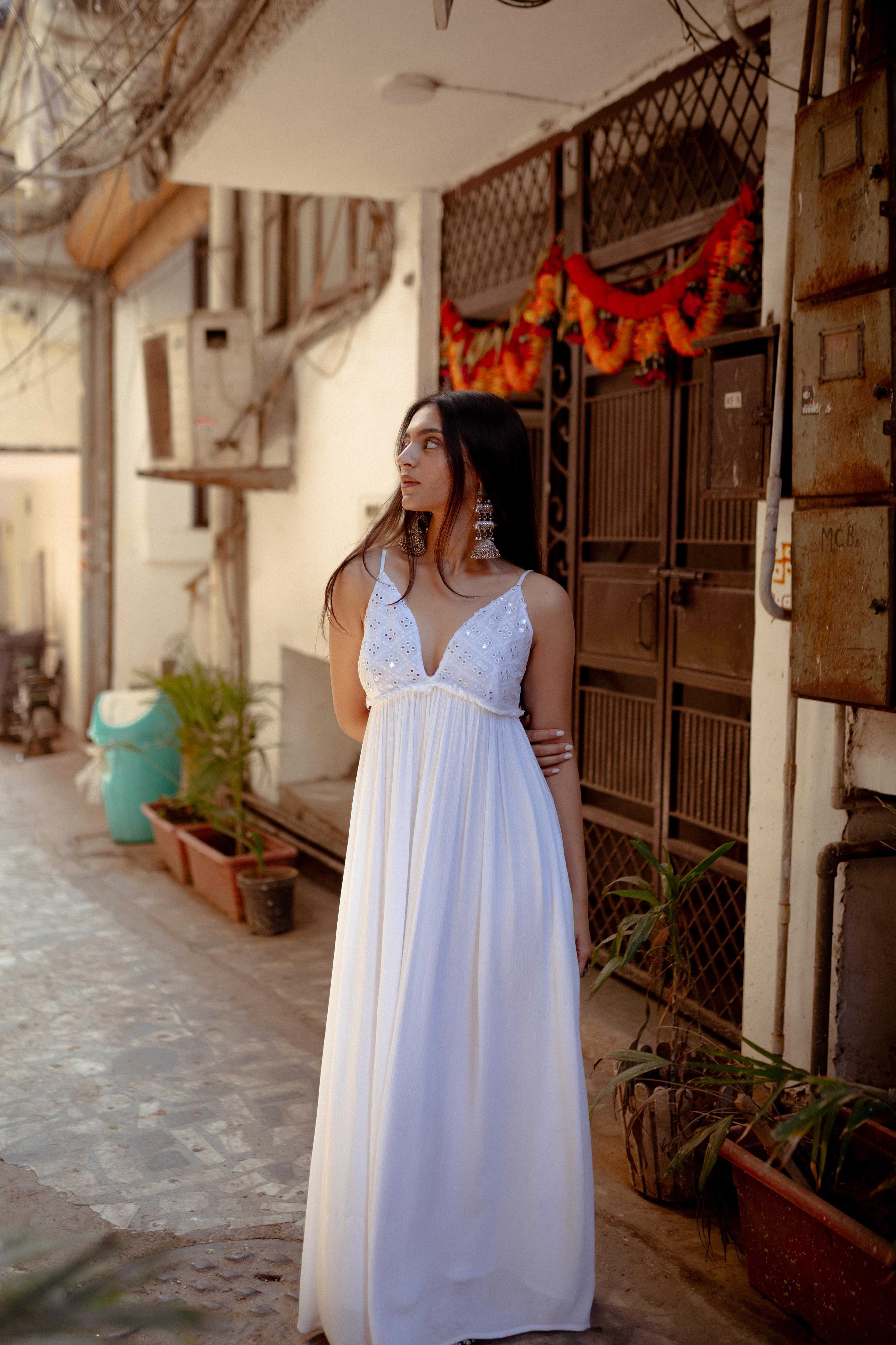 The Sheesha Dress is a full-length, flowy silhouette in white with a deep V neckline and mirrorwork across the bust. Designed for ease and movement, it features a soft drape through the body and hidden side pockets for functionality without bulk.